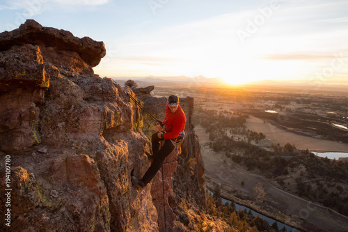 © edb3_16, Obraz premium Adventurous man is rappeling down a cliff during a bright and vibrant sunny sunset. Taken in Smith Rock, Oregon, North America.