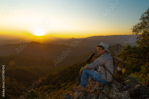 © EKKAPON, Naklejka premium Adventurous man with binoculars standing in the forest