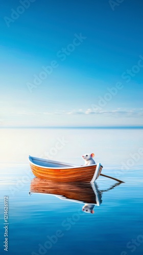 Naklejka premium Adventurous mouse in a wooden boat serene lake digital artwork tranquil...