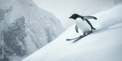 Fototapeta premium Adventurous Penguin Skiing in the Snow