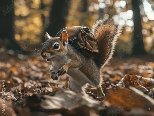 © Image Tree, Obraz premium Adventurous squirrel wearing a tiny backpack in the forest