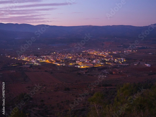 © Búho, Obraz premium Adzaneta del Maestre, a village in El Maestrazgo, in the Province of Castellón, Spain, illuminated at night, from the mountains of El Bovalar