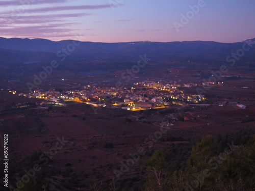 © Búho, Obraz premium Adzaneta del Maestre, a village in El Maestrazgo, in the Province of Castellón, Spain, illuminated at night, from the mountains of El Bovalar