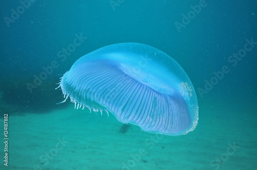 Fototapeta premium Aequorea jellyfish hovering close to sandy bottom.