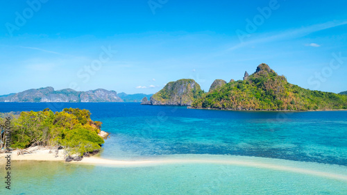 © SASITHORN, Fototapeta premium Aerail view of tropical exotic island sand bar separating sea in two with turquoise in El Nido, Palawan, Philippines.