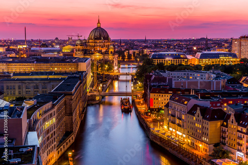 © Subodh, Naklejka premium Aerial Berlin panorama panoramę z wieży telewizyjnej i rzeką Szprewą o zachodzie słońca, Niemcy