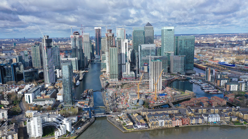 © aerial-drone, Fototapeta premium Aerial bird's eye panoramic photo taken by drone of iconic Canary Wharf skyscraper complex and business district, Isle of Dogs, London, United Kingdom