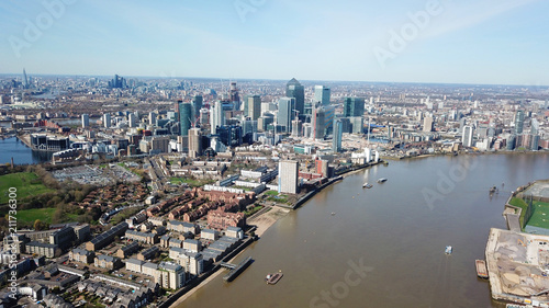 Obraz premium Aerial bird's eye view photo taken by drone of famous Docklands and Canary Wharf skyscraper complex, Isle of Dogs, London, United Kingdom