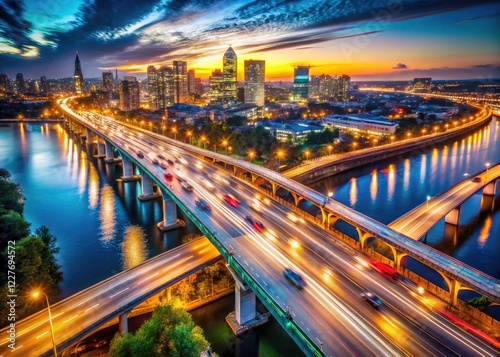 © ChannelPIC, Fototapeta premium Aerial bokeh captures Jackson Street Bridge's nighttime traffic flow, city lights twinkling below.
