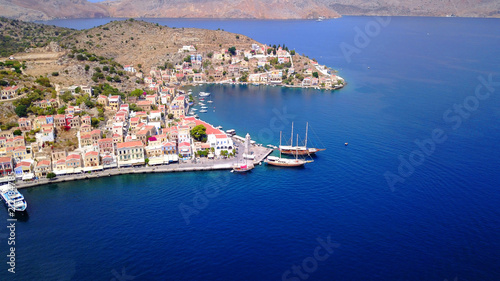 © aerial-drone, Fototapeta premium Aerial brid's eye photo taken by drone of Yalos, iconic port of Symi island, Dodecanese, Greece