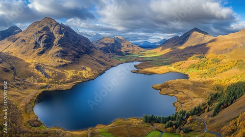 © Chaweewan, Fototapeta premium Aerial capture of Glencoes serene highland lakes, reflecting the surrounding mountain scenery