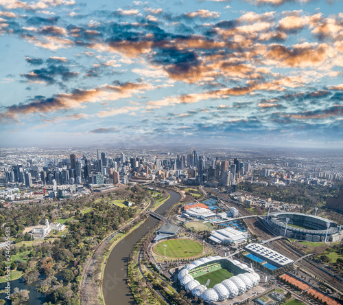 Obraz premium Aerial city view from helicopter at sunset, Melbourne