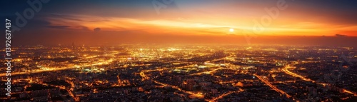© Arif, Obraz premium Aerial cityscape illuminated by the warm colors of a sunset