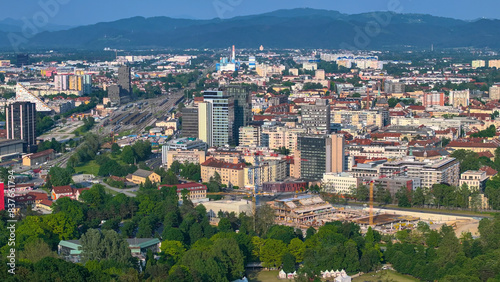 Naklejka premium AERIAL: Developing part of Ljubljana with a large construction site and railway.