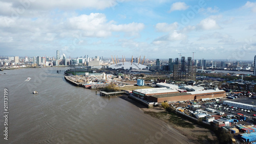 Naklejka premium Aerial drone bird's eye view from iconic O2 Arena near isle of Dogs as seen...
