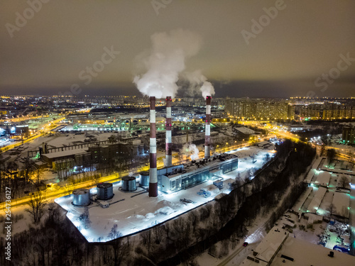Obraz premium Aerial drone footage of power plant in Saint Petersburg during cold winter night.