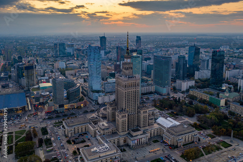 © Daniel Jędzura, Fototapeta premium Aerial drone in Warsaw skyscrapers nad centre.