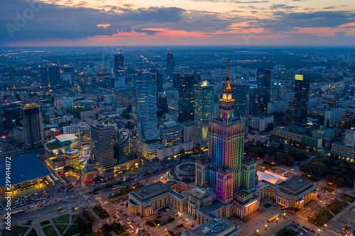 © Daniel Jędzura, Fototapeta premium Aerial drone in Warsaw skyscrapers nad centre.