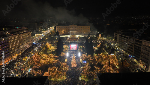 © aerial-drone, Fototapeta premium Aerial drone night shot of illuminated iconic Syntagma square at new year's eve celebration with fireworks welcoming 2024, Athens, Attica, Greece