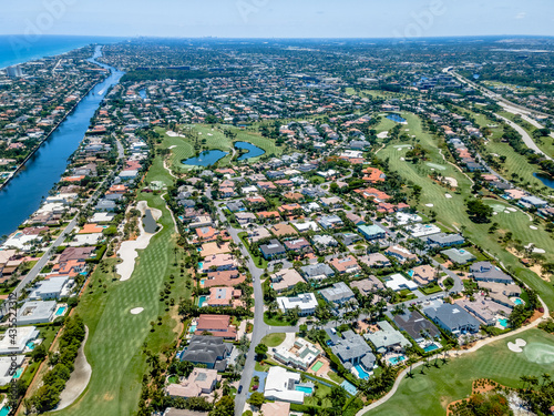 © Matthew Tighe, Fototapeta premium aerial drone of Golf course in Boca Raton, Florida with city