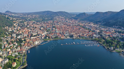 © aerial-drone, Fototapeta premium Aerial drone panoramic photo of famous beautiful lake Como one of the deepest in Europe, Lombardy, Italy