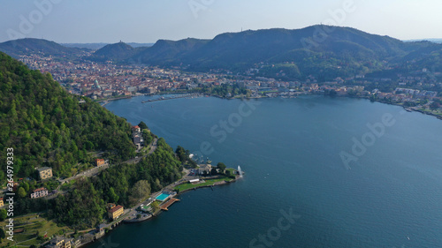 © aerial-drone, Fototapeta premium Aerial drone panoramic photo of famous lake Como one of the deepest in Europe, Lombardy, Italy
