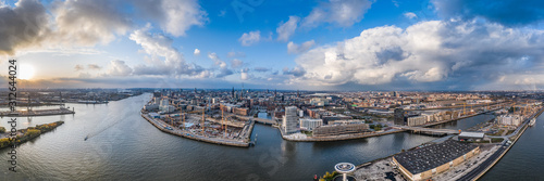 Fototapeta premium Aerial drone panoramic view of port of Hamburg from above before sunset with dramatic stormy clouds over historical city center