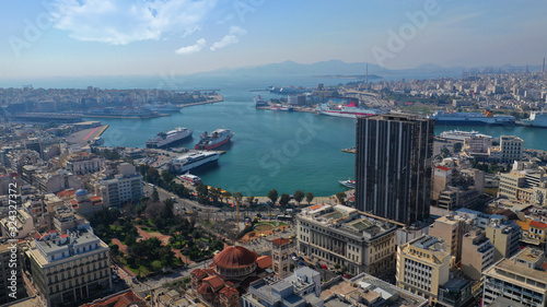 © aerial-drone, Fototapeta premium Aerial drone photo of abandoned old public landmark skyscraper in famous busy port of Piraeus, Attica, Greece