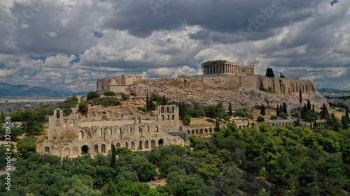 © aerial-drone, Fototapeta premium Aerial drone photo of Acropolis of Athens in Attica, Greece, with the Parthenon Temple on top of the hill during a cloudy spring day