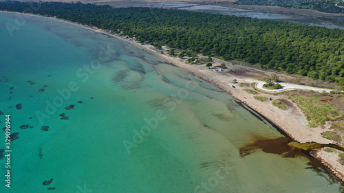 Fototapeta premium Aerial drone photo of beautiful turquoise beach and rare pine tree forest of Shinias area of Attica a natural preserve, Greece