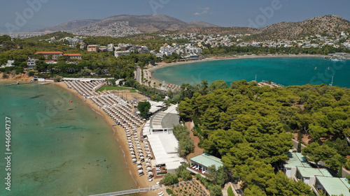 © aerial-drone, Naklejka premium Aerial drone photo of famous celebrity sandy beach of Astir or Asteras in south Athens riviera with turquoise clear waters, Vouliagmeni, Greece