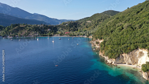 © aerial-drone, Fototapeta premium Aerial drone photo of famous small bay and beach with crystal clear sea and caves of Desimi near Nidri in island of Lefkada, Ionian, Greece