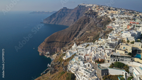Obraz premium Aerial drone photo of Fira main village of Santorini island with breathtaking...