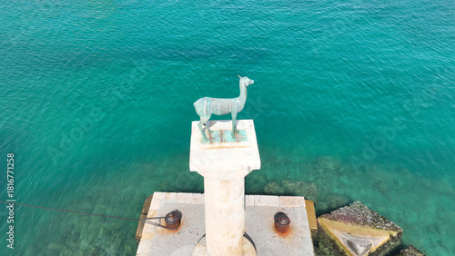 © aerial-drone, Naklejka premium Aerial drone photo of iconic Doe statue in entrance of Mandraki harbor where Colossus of Rhodes island was standing, Dodecanese, Greece