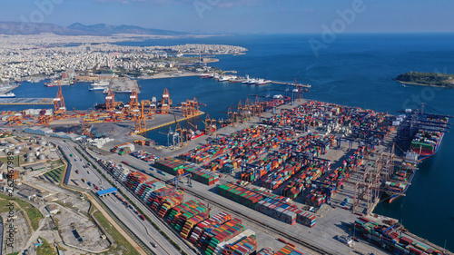 © aerial-drone, Fototapeta premium Aerial drone photo of industrial container terminal in commercial port of Piraeus, Perama, Attica, Greece