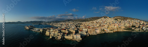 © aerial-drone, Fototapeta premium Aerial drone photo of pictruesque district built by the sea of Vaporia in main town of Syros or Siros island Ermoupolis near famous church of Agios Nikolaos, Cyclades, Greece