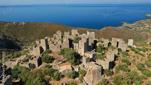 © aerial-drone, Fototapeta premium Aerial drone photo of picturesque abandoned old stone tower village of Vatheia overlooking deep blue sea in Mani Peninsula, Peloponnese, Greece