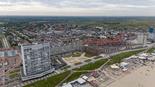 © Robin, Fototapeta premium Aerial drone photo of the beach, boulevard and restaurants in the coastal town named Zandvoort in the Netherlands.