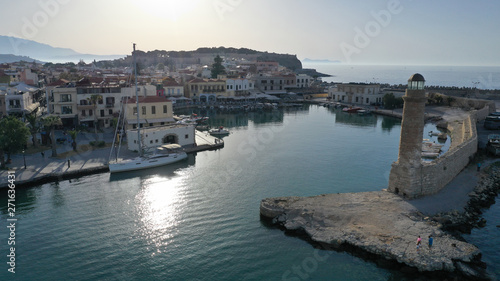 © aerial-drone, Fototapeta premium Aerial drone photo of unique old picturesque Venetian port with old lighthouse in the heart of famous city of Rethymno, Crete island, Greece