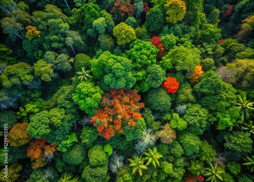 Naklejka premium Aerial Drone Shot: Lush Exotic Rainforest Canopy, Vivid Green and Red Leaves