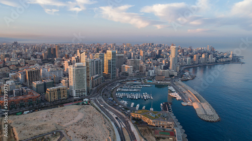 © Ramzi, Obraz premium Aerial drone shot of Beirut skyline at sunrise