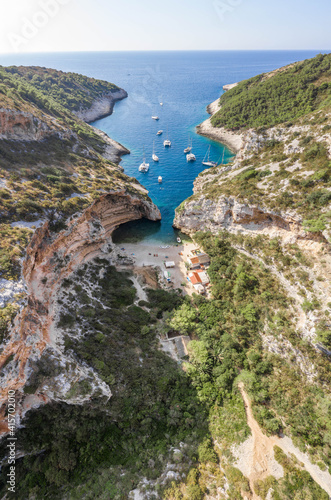 © davidzzzfr, Fototapeta premium Aerial drone shot of iconic Stiniva cove beach of Adriatic sea on Vis Island in Croatia summer