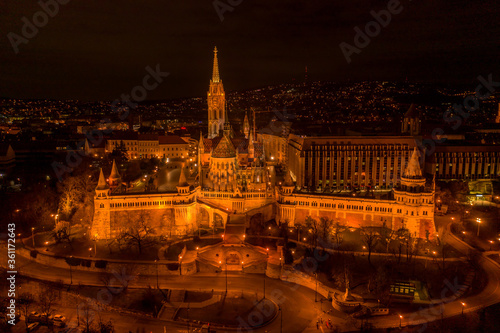 Fototapeta premium Aerial drone shot of Matthias Church with lights on Buda Hill in Budapest...