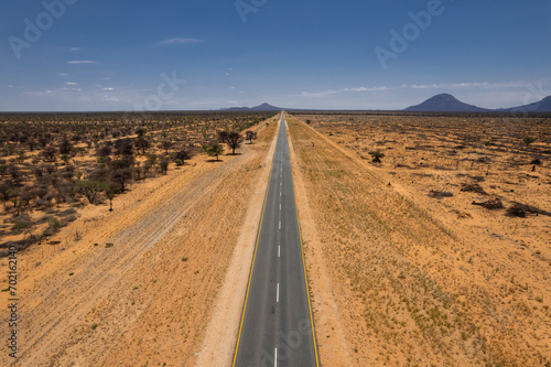 © radudumitrescu, Naklejka premium Aerial drone shot of straight and empty road from Namibia, Africa.