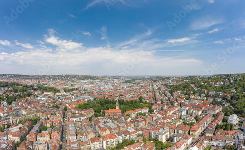 © davidzzzfr, Obraz premium Aerial drone shot of Stuttgart suburb at summer noon