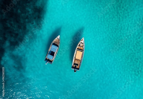 © Sama, Fototapeta premium Aerial Drone Shot of Two Boats on Turquoise Sea with National Geographic Precision. AI generated illustration