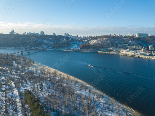 © Sergey, Obraz premium Aerial drone view. A ship floats along the Dnieper River in a snowy morning.