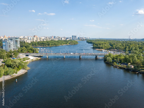 Obraz premium Aerial drone view. Automobile bridge over the Dnieper river in Kiev.