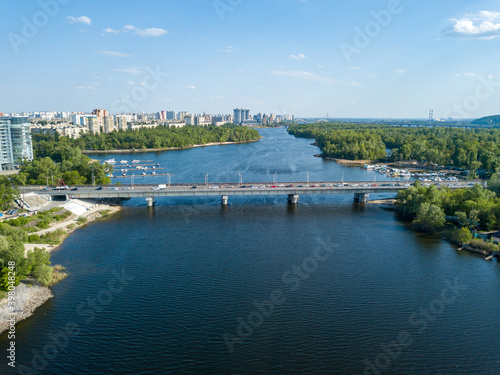 © Sergey, Fototapeta premium Aerial drone view. Automobile bridge over the Dnieper river in Kiev.