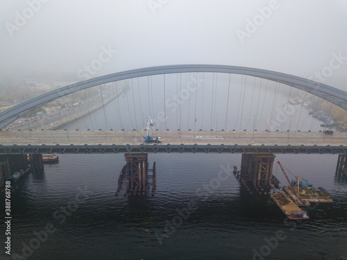 © Sergey, Fototapeta premium Aerial drone view. Construction of a cable-stayed bridge across the river in dense fog.